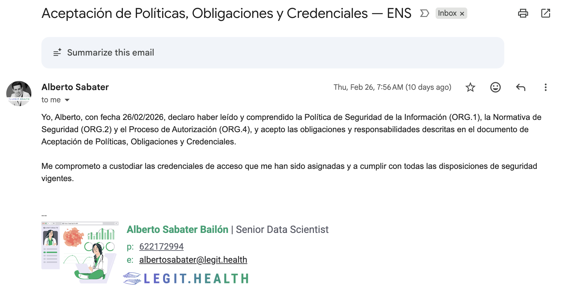Yo, [nombre completo], con fecha [fecha], declaro haber leído y comprendido la Política de Seguridad de la Información (ORG.1), la Normativa de Seguridad (ORG.2) y el Proceso de Autorización (ORG.4), y acepto las obligaciones y responsabilidades descritas en el documento de Aceptación de Políticas, Obligaciones y Credenciales.